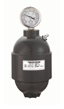 Баллонный тип отличается от мембранного более высоким амортизирующим эффектом за счёт резинового баллона, заполненного сжатым воздухом (газом). Вначале рабочая среда сжимает воздух в баллоне, а затем при снижении давления, воздух в баллоне вытесняет жидкость в трубопровод, обеспечивая высокую равномерность подачи и сглаживание пульсаций давления на напорной стороне. Поскольку материал баллона изготавливается из резины (NBR, EPDM, FKM) диапазон его использования ограничен химической стойкостью. Демпферы оборудованы манометром.